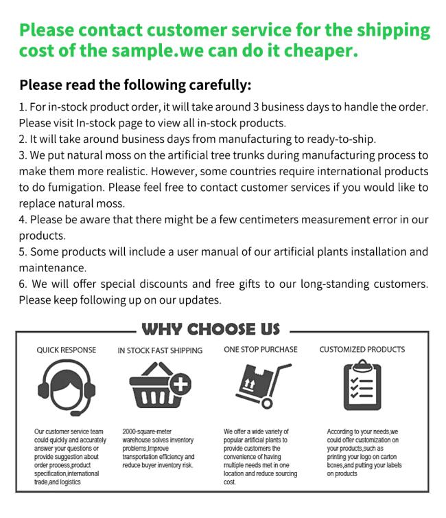 本物 の 植物 に 必要 な 定期 的 な 整備 に 加え て,日光,水,排水 を 確保 する ため に 植物 を 移動 する 必要 が あり ます.温度 の 変動 が 問題 に なる こと が あり ます人工植物とは違います 低品質の製品であれば 植物に消えるのを防ぐために 時々移動する必要があるかもしれません.葉っぱが塵を集める場合 片付けることもできます