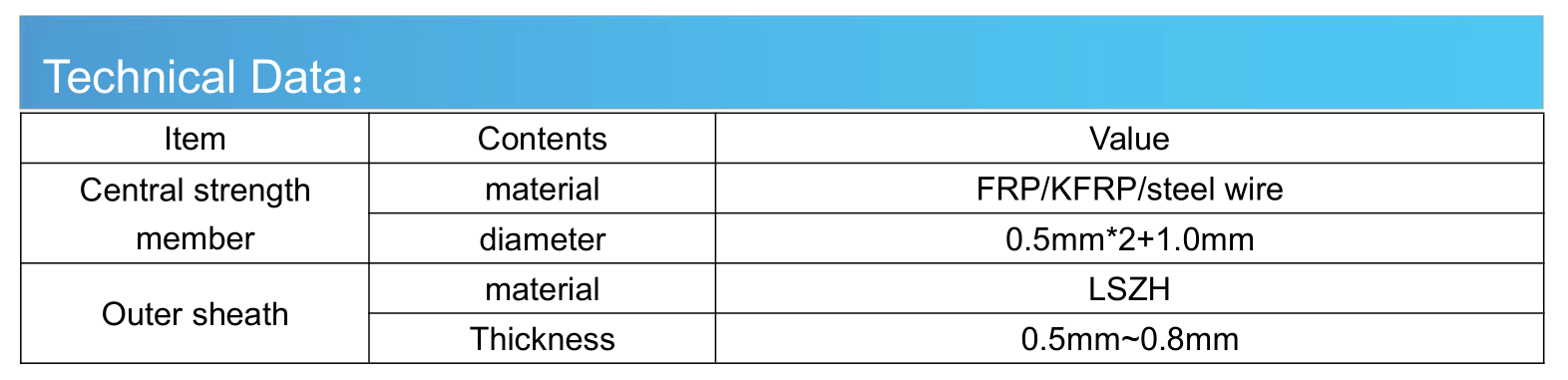 | 中央強さメンバー材料 | FRP/KFRP/Steelワイヤー | 中央強さメンバーの直径 | 0.5mm*2+1.0mm |