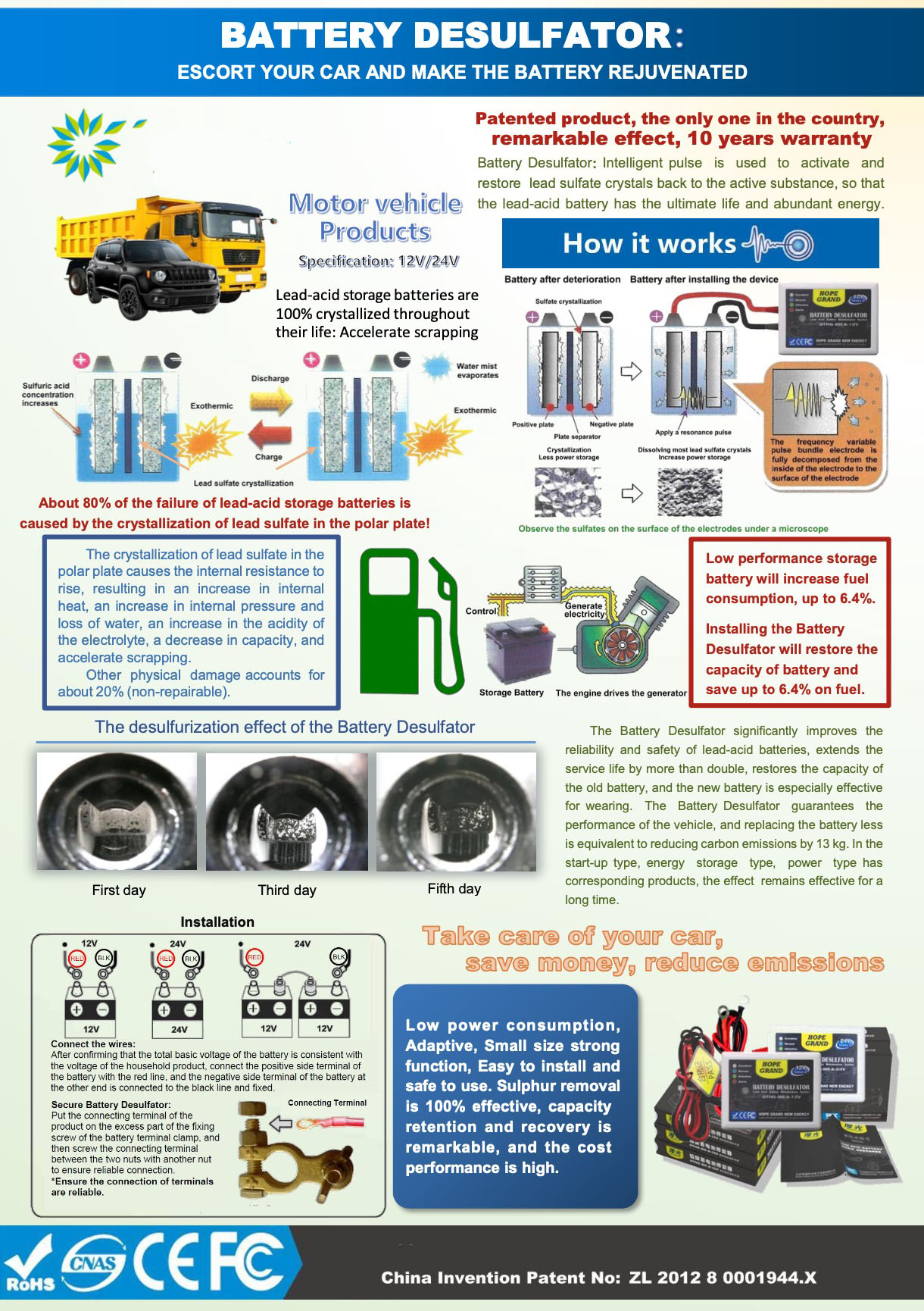 バッテリー脱硫器は、鉛蓄電池の信頼性と安全性を大幅に向上させ、耐用年数を2倍以上延長し、古いバッテリーの容量を回復し、新しいバッテリーは特に着用に効果的です。バッテリー脱硫器は車両の性能を保証し、バッテリーの交換を少なくすることは、炭素排出量を13kg削減することに相当します。スタートアップタイプ、エネルギー貯蔵タイプ、パワータイプには対応する製品があり、効果が長く持続します。