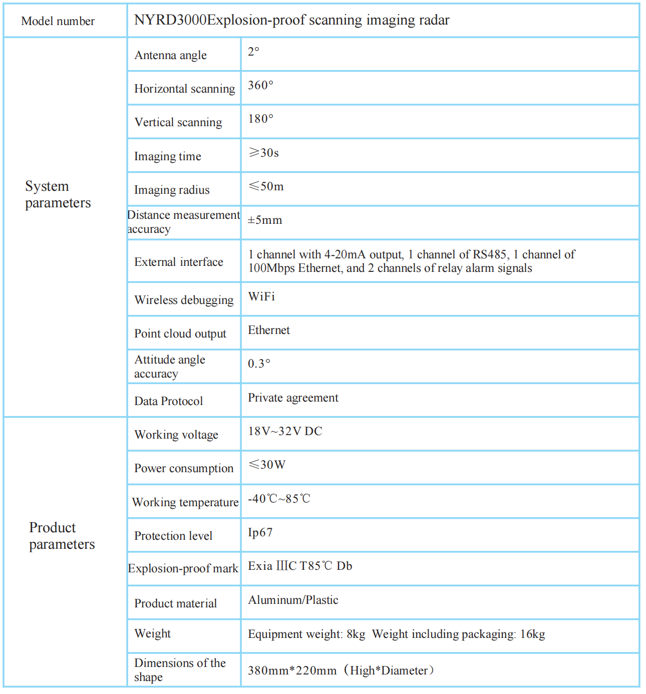 防爆スキャンイメージングレーダーは、360度の2次元軸スキャンにより、保管サイロ、タンク、保管小屋のリアルタイム材料スキャンを室温で行うことができます。空間範囲内の静的ターゲット検出、点群データ出力、空間スキャンイメージング、体積および重量計算出力などの機能を可能にし、雨、ほこり、光などの悪環境の影響を受けません。